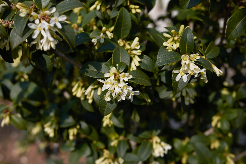 Mit ihren dunkelgrünen, ledrigen Blättern bleibt die Duftblüte das ganze Jahr über attraktiv. Gleichzeitig ist sie sehr schnittverträglich und lässt sich problemlos in Form halten – ideal für gepflegte Gärten und moderne Außenanlagen.